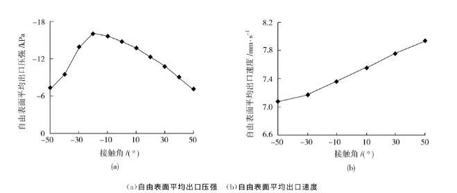 圖10接觸角對自由表面出口壓強與速度的影響