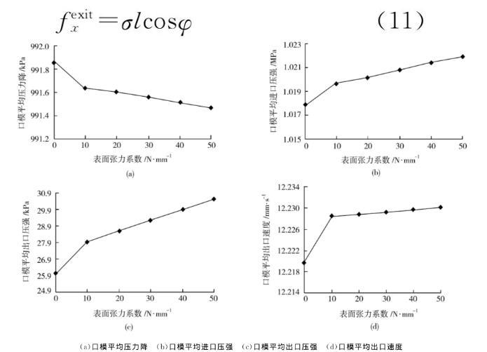(2)在微擠出中,表面張力系數(shù)越大,擠出脹大越明顯,擠出口模內(nèi)熔體的進出口壓強都明顯增大,口模內(nèi)熔體的壓力降略微減小,平均出口速度略微增大,自由表面出口壓力與平均出口速度都明顯減小;