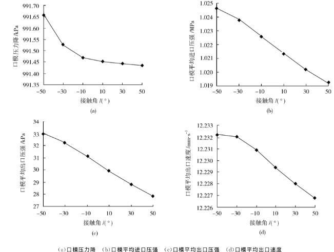 在表面張力系數(shù)為50N/mm不變時,接觸角取值:-50°~50°。得到口模壓力降、口模平均進出口壓力、以及口模出口平均速度曲線如圖8所示。由圖8可知,接觸角與口模流場參數(shù)的關(guān)系并不是線性關(guān)系。由圖6可知接觸角θ增大,自由表面擠出脹大比值減小,φ減小,表面張力對口模出口處的軸向分力如式(9)所示,牽引力隨著夾角φ值的減小而增大,使得材料在口模內(nèi)的剪切能量損失減小,因此壓力降減小。所以圖8(a)中口模平均進出口壓力降減小。而圖8(b)、(c)中口模內(nèi)熔體進出口壓強的減小是因為擠出脹大減小,自由表面對外做功減小,自由表面對口模的阻力減小。圖8(d)中口模平均出口速度減小是因為表面張力對自由表面的徑向分力減小,口模內(nèi)熔體出口徑向速度減小,而熔體軸向速度不變,因此平均速度減小。
