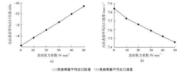 圖9表面張力系數(shù)對自由表面出口壓強與速度的影響
