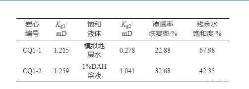 將一塊巖心截為兩塊,測量兩塊巖心干態(tài)下氣測滲透率Kg1,之后將兩塊巖心分別飽和模擬地層水和DAH溶液,使用氮氣在相同壓力下將兩塊巖心驅(qū)替至平衡,測量巖心氣測滲透率Kg2及殘余水飽和度,計算氣驅(qū)后滲透率與干態(tài)下滲透率比值,即為巖心滲透率恢復(fù)率。如表2所示,使用模擬地層水飽和巖心后,滲透率恢復(fù)率僅有22.88%,水鎖損害嚴(yán)重,而使用1%DAH溶液飽和巖心后,滲透率恢復(fù)率高達(dá)82.68%,水鎖損害程度大幅降低,殘余水飽和度更低,液相返排也更容易。