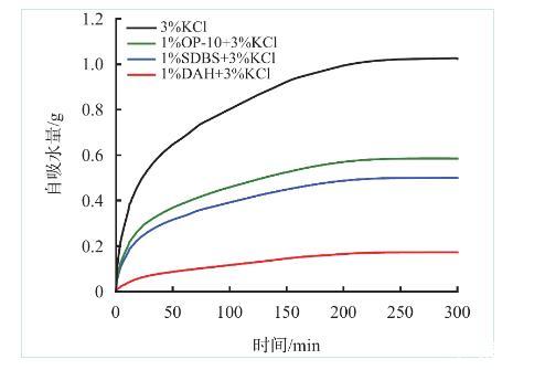 由圖5可以看出,水相會在毛細(xì)管力的作用下自吸入巖心,初始階段巖心的自吸水量較大,經(jīng)過200 min后達(dá)到平衡,自吸水量不再增加;加入DAH后,巖心自吸水量下降83.1%,且相較于常用防水鎖劑OP-10、SDBS效果更佳。圖6同樣表明,加入DAH后,巖心自吸水速率大幅降低,整個自吸過程中速率緩慢。上述實驗表明,DAH可以減少因毛細(xì)管力被吸入地層的水相,從而降低水鎖損害發(fā)生的風(fēng)險。