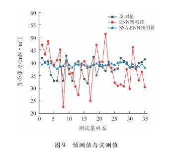 圖9給出了以140組樣本為訓練集對ENN和SSAENN預(yù)測模型進行訓練后,其余未參加訓練的35組樣本的界面張力預(yù)測值。與測試集的界面張力實測值相比,ENN預(yù)測模型的預(yù)測值整體差值較大,預(yù)測差值最大為14.58mN/m,最小為1.38mN/m;SSAENN預(yù)測模型的整體預(yù)測差值較小,個別變壓器油測試樣本的預(yù)測差值較大,預(yù)測差值最大為6.08mN/m.