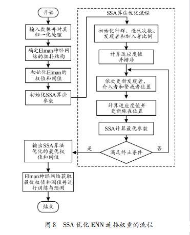 3.2.2SSASSA是模擬麻雀群體覓食和反捕食行為提出的群智能優(yōu)化算法。圖8展示了SSA優(yōu)化ENN連接權(quán)重的流程。