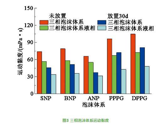 DPCG與DWS和聚合物具有較強的靜電、范德華力和纏繞作用,使其三相泡沫體系具有較大的拉伸黏度、剪切黏度和黏彈性,導(dǎo)致DPCG三相泡沫體系運動黏度最大。而PPCG僅具有短支鏈,與DWS和聚合物的靜電、范德華力和纏繞作用相對較弱,導(dǎo)致其運動黏度低于DPCG的。硬質(zhì)納米顆粒在溶液中與DWS和聚合物的靜電、范德華力和纏繞作用較弱,因此其三相泡沫體系運動黏度較低。