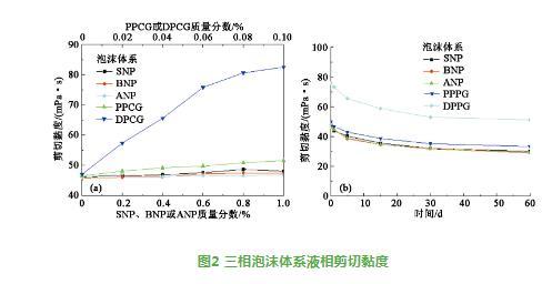 三相泡沫體系液相剪切黏度如圖2所示。由圖2(a)可知,隨著顆粒質(zhì)量濃度增加,DPCG三相泡沫體系液相的剪切黏度先快速增加,而后趨于平穩(wěn),而PPCG體系的剪切黏度僅略有增加。SNP、BNP或ANP對三相泡沫體系液相的剪切黏度影響較小。由圖2(b)可知,隨時間增加,不同三相泡沫體系液相的剪切黏度先快速降低,而后趨于平穩(wěn)。PPCG或PPCG三相泡沫體系液相剪切黏度保留率接近67%,SNP、BNP或ANP體系的保留率約為63%。