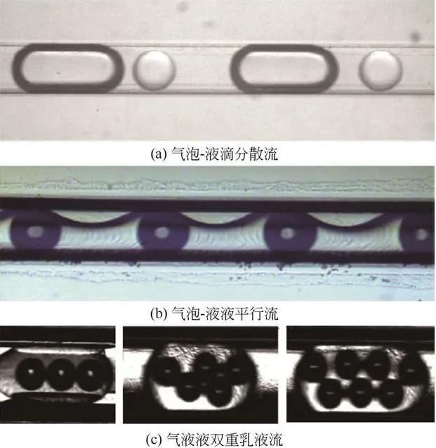 上述不同類型的微通道中所形成的流型也是學(xué)者們重點關(guān)注的內(nèi)容。在材料制備領(lǐng)域,流型是決定合成材料結(jié)構(gòu)的關(guān)鍵因素且直接影響著材料的相關(guān)性能;在過程強(qiáng)化領(lǐng)域,不同流型的強(qiáng)化效果差別較大,選擇并調(diào)控合適的流型是重中之重;在三相反應(yīng)中,流型可決定反應(yīng)的轉(zhuǎn)化率和選擇性,是需要優(yōu)化的重要參數(shù)之一。相比于兩相體系,三相體系由于流體間更為復(fù)雜的相互作用及更高的自由度而呈現(xiàn)出了更多的流動形態(tài)(圖3)。如Su等在十字形微通道中成功調(diào)控出液滴氣泡間隔排列的氣液液三相流。Xu等基于同軸環(huán)管微設(shè)備實現(xiàn)了氣液液雙乳液的可控制備,并揭示了流量和界面張力等因素對雙乳液結(jié)構(gòu)的影響。Wang等在雙T形通道內(nèi)通過調(diào)節(jié)操作條件可控制備了“水包油包氣”和“含有氣泡的液液平行流”兩種結(jié)構(gòu)。Rajesh等通過觀察液滴氣泡的形狀及位置關(guān)系定義了“氣柱-液柱”“彈狀-液滴”“液柱-雙氣彈”等流型。除了實驗手段Rajesh等借助VOF數(shù)值模擬方式從機(jī)理上揭示了氣液液三相流的流動規(guī)律,歸納了不同Ca和We范圍內(nèi)的流型特征和規(guī)律。此外,Yang等通過傳質(zhì)引發(fā)相分離的方法成功調(diào)控出氣液液雙乳液,該方法能實現(xiàn)更大范圍內(nèi)氣泡直徑尺寸和液膜厚度的調(diào)節(jié)。