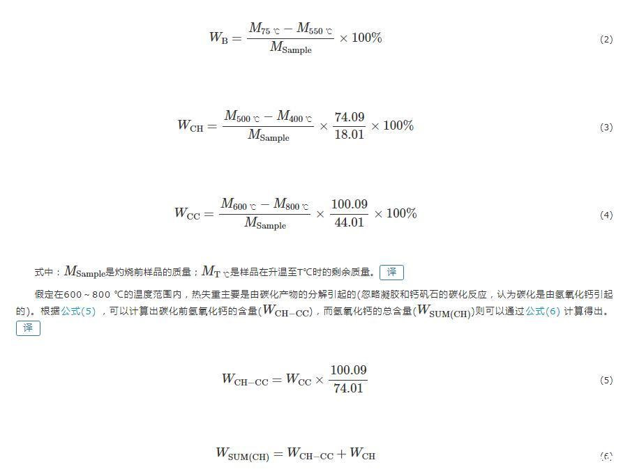 假定在600~800℃的溫度范圍內(nèi),熱失重主要是由碳化產(chǎn)物的分解引起的(忽略凝膠和鈣礬石的碳化反應,認為碳化是由氫氧化鈣引起的)。根據(jù)公式(5),可以計算出碳化前氫氧化鈣的含量,而氫氧化鈣的總含量則可以通過公式(6)計算得出。
