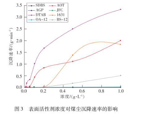 由表4和圖3可以看到,當濃度為0.1 g/L時,煤塵在AOT和APG溶液中的沉降時間不到1 min,而在陽離子和兩性型表面活性劑溶液中的沉降時間超過1 h。在同一濃度下,煤塵在不同表面活性劑溶液中的沉降時間相差較大,表面活性劑自身性質(zhì)影響潤濕煤塵的作用。當濃度增大到各表面活性劑的臨界膠束濃度附近時,煤塵在陰離子和非離子表面活性劑中的沉降時間會急劇下降,縮短至5 min之內(nèi),但在陽離子和兩性型表面活性劑中沉降時間依然大于1 h??傮w而言,8種表面活性劑潤濕煤塵的能力由強到弱依次排序為:APG>AOT>JFC>SDBS>OA-12>BS-12>1631>CTAB,這與表面活性劑降低表面張力的能力排序基本一致。陽離子表面活性劑潤濕煤塵效果最差,主要是因為親水頭基的正電荷與煤塵所帶負電荷之間的靜電力大于疏水基團之間的范德華力,形成了親水基團朝向煤塵表面、疏水基團朝向水的單分子膜,不利于潤濕。APG潤濕煤塵效果最好主要與其自身結(jié)構(gòu)有關,APG分子結(jié)構(gòu)碳原子上的醇羥基與水分子之間存在強烈相互作用,間接弱化了烷基糖苷分子結(jié)構(gòu)中親水基團與煙煤表面含氧親水官能團之間的吸附作用,更有利于疏水基團與煤塵表面的疏水基團發(fā)生強烈相互作用,以親水頭基伸向溶液,疏水尾部吸附在煤塵上的方式排列,降低了溶液及固-液界面張力,增加了煤塵親水性。APG濃度達到0.02 g/L時,煤塵沉降時間僅為057 min,沉降速率為0.18 g/min,潤濕煤塵效果良好,當濃度繼續(xù)增大,潤濕煤塵作用變化不大,綜合考慮成本及效率后,選擇濃度為0.02 g/L的APG作為低階煤用噴霧抑塵法的添加劑。
