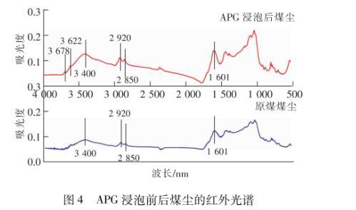 由上述實驗結(jié)果可以看到,在8種表面活性劑中,非離子表面活性劑APG形成膠束和降低表面張力的能力最強,潤濕煤塵效果最好。通過測定APG浸泡前后煤塵表面官能團及粒徑分布特征的變化,分析其潤濕煤塵的作用機理。