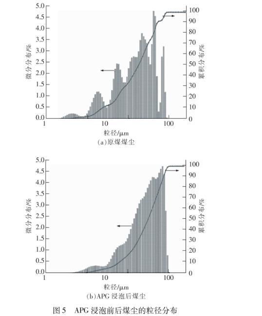由圖5可見,經(jīng)APG浸泡后煤塵粒徑增大。原煤煤塵的平均粒徑為22.62μm,經(jīng)APG浸泡后增大到3518μm。浸泡前煤塵的粒徑分布不均勻,粒徑眾數(shù)為48.41μm,浸泡后煤塵粒徑的均一性增強,呈較典型的正態(tài)分布,粒徑眾數(shù)也增大至76.51μm。這說明煤塵表面親水官能團的增加和分子間締合氫鍵的形成,促使煤塵之間發(fā)生了團聚作用,使原本無法發(fā)生重力沉降的“小粒徑”煤塵變成了能夠發(fā)生重力沉降的“大粒徑”顆粒,加快了沉降速率,縮短了沉降時間,與煤塵沉降實驗結(jié)果一致。