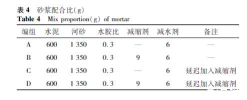 制備四組砂漿,B、D組中的水用SRA按照5%(質(zhì)量分?jǐn)?shù))進(jìn)行替換。B組中的SRA與水混合后直接加入水泥中攪拌,A組除不含SRA外與B組一致。而C、D組分兩步混合,C組先只加入95%的水進(jìn)行攪拌,完成后用塑料薄膜覆蓋攪拌鍋靜置15min,然后加入余下的水以中速攪拌3min,D組與C組唯一不同的地方在于先加入95%的水,最后加入的是余下5%的SRA,具體如表4所示。