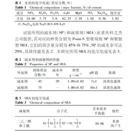 試驗(yàn)所用的減水劑(SP)和減縮劑(SRA)由重慶科之杰公司提供,其對應(yīng)的種類分別為PointS型聚羧酸SP和聚醚型SRA,它們的固含量分別為45%和75%,SP的減水率可達(dá)29%,具體性能見表2.本研究所用SRA的化學(xué)組成見表3.