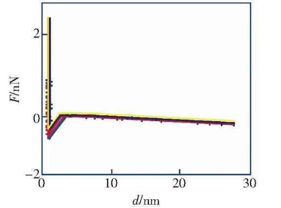 圖2a是探針在超純水中HOPG表面測(cè)得的力-位移曲線,當(dāng)分離距離大于5 nm時(shí),針尖和表面之間的作用力主要為斥力。由于實(shí)驗(yàn)中的水呈弱酸性(PH約5.6),而研究表明,HOPG表面在弱酸性水中帶弱負(fù)電荷,探針針尖(單晶硅)在水中也認(rèn)為是帶弱負(fù)電荷。因此,這個(gè)斥力可以解釋為雙電層(Electrostatic double layer,EDL)引起的。當(dāng)分離距離小于5 nm時(shí),在范德華力的作用下,針尖產(chǎn)生‘跳進(jìn)’(jump in)現(xiàn)象并與HOPG表面接觸,整個(gè)力曲線符合DLVO理論。醇-水替換之后,在10 10掃描區(qū)域內(nèi)采用Taping-Mode模式(95%的set-point)以1 Hz的掃描頻率,如圖3a所示,HOPG表面上生成的納米氣泡呈球冠狀,相應(yīng)的三維圖如圖3d所示。