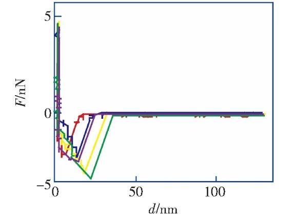 筆者利用原子力顯微鏡實(shí)驗(yàn)測(cè)量了HOPG表面在醇-水替換前后的力距離曲線,發(fā)現(xiàn)醇-水替換前進(jìn)針曲線的跳進(jìn)距離小于5 nm,滿足DLVO理論;而在醇-水替換后納米氣泡覆蓋率為21.8%的情況下,進(jìn)針曲線的跳進(jìn)距離均大于10 nm,不能再用DLVO理論解釋,證明了IGE與納米氣泡共存這一現(xiàn)象。根據(jù)改進(jìn)的Laplace-Young方程,結(jié)合文獻(xiàn)中對(duì)納米氣泡線張力值的計(jì)算結(jié)果,分析負(fù)的線張力對(duì)過(guò)渡區(qū)內(nèi)局部表面張力及局部固-液界面的影響,導(dǎo)致納米氣泡的接觸角反常小的原因之一。分析并討論雜質(zhì)對(duì)納米氣泡接觸角的影響,指出IGE與納米氣泡共存、線張力及雜質(zhì)影響的共同作用是導(dǎo)致納米氣泡接觸角“反常小”的原因。