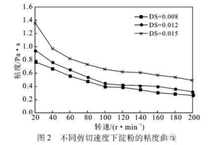 粘度是反映液體流變性能最常用的指標(biāo),粘度越小其流變性越高。由圖2可知,在同一轉(zhuǎn)速下,隨著取代度的增加,棕櫚酸酯淀粉糊液粘度升高;隨轉(zhuǎn)速增大,粘度先急劇下降后逐漸趨向平緩。棕櫚酸酯淀粉糊液粘度隨剪切速率的增大而減小,呈現(xiàn)“剪切稀化”特性,屬假塑性流體。淀粉糊液“剪切稀化”的程度與分子鏈的長(zhǎng)短有關(guān),高DS淀粉酯相對(duì)分子質(zhì)量較高,“剪切稀化”程度也較大。淀粉糊液表觀粘度隨著剪切速率的增大而降低,表明淀粉凝膠網(wǎng)絡(luò)體系中分子間或分子內(nèi)的作用力(氫鍵)在較高的剪切速率下更容易被破壞。當(dāng)剪切速率繼續(xù)增加到淀粉分子纏結(jié)點(diǎn)、范德華力作用點(diǎn)被破壞完全來(lái)不及重建時(shí),淀粉糊液表觀粘度趨于最小值。