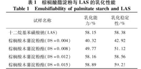棕櫚酸酯淀粉與常用表面活性劑LAS的乳化性能比較見(jiàn)表1。