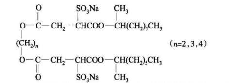 乙二醇雙子琥珀酸二仲辛酯磺酸鈉(GSS271)、1,3-丙二醇雙子琥珀酸二仲辛酯磺酸鈉(GSS371)、1,4-丁二醇雙子琥珀酸二仲辛酯磺酸鈉(GSS471)(結(jié)構(gòu)式如下,實(shí)驗(yàn)室自制。提純后測(cè)定,表面張力曲線無(wú)最低點(diǎn),說(shuō)明不含高活性雜質(zhì)),實(shí)驗(yàn)用水均為二次去離子水經(jīng)亞沸重蒸。