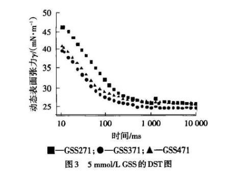 為此,有關(guān)連接基的研究較多集中在對(duì)靜態(tài)性能方面的分析,而對(duì)動(dòng)態(tài)性能的研究較少。本實(shí)驗(yàn)對(duì)自主研發(fā)的乙二醇雙子琥珀酸二仲辛酯磺酸鈉(GSS271)、1,3-丙二醇雙子琥珀酸二仲辛酯磺酸鈉(GSS371)與1,4-丁二醇雙子琥珀酸二仲辛酯磺酸鈉(GSS471)陰離子雙子表面活性劑的DST進(jìn)行研究,并考察連接基對(duì)動(dòng)態(tài)表面性能的影響,探討其吸附動(dòng)力學(xué)機(jī)理。
