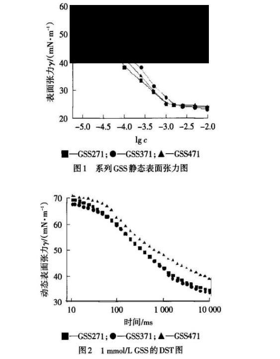 雙磺基琥珀酸酯磺酸鈉(簡(jiǎn)稱GSS)通過(guò)柔性連接基將兩個(gè)傳統(tǒng)的琥珀酸酯鹽連接而成,連接基使GSS分子中兩個(gè)離子頭基間的靜電斥力大大削弱,同時(shí)加強(qiáng)了碳?xì)滏滈g的疏水結(jié)合力,使GSS具有比單鏈琥珀酸酯磺酸鹽更低的臨界表面張力。