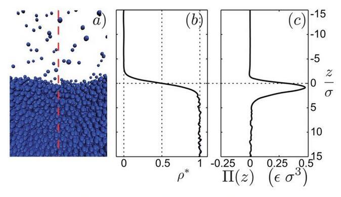 當(dāng)分子間距較小時,斥力為主,分子間距較大時,引力為主。在斥力與引力平衡時,Lennard-Jones勢能最小?,F(xiàn)在,我們就可以來詳細(xì)地考慮液-氣界面了。圖5a是通過分子動力學(xué)仿真得出的液-氣界面照片,對應(yīng)的時間平均密度分布圖是圖5b。從高密度的液體到低密度的氣體發(fā)生在一個幾個分子厚度的窄區(qū)域。為了確定毛細(xì)力,我們沿垂直界面方向?qū)⑾到y(tǒng)分為兩個子系統(tǒng)(圖5a)??紤]左邊子系統(tǒng)對右邊子系統(tǒng)的單位面積的作用力,即應(yīng)力,在豎直方向上的分布。這個力有兩個來源:壓力P和額外壓力Π(圖5c)。圖5c表明有個力局部存在于界面附近,其實這個力就是表面張力,且這個力范圍和密度突變的范圍很相似。這說明表面張力的確是一個真實的力,而不僅僅是表面能的一種純數(shù)學(xué)描述。既然我們發(fā)現(xiàn)在界面附近的確局部存在一個平行的力,那我們回到問題1,為什么表面張力平行于界面而不是垂直于界面?我們注意到圖1僅僅描繪了分子間引力作用。更全面的圖應(yīng)該如圖6所示,包含了引力與斥力作用。在遠(yuǎn)離界面的液體本體內(nèi),由于液體分子周圍的完全對稱性,分子的受力完全平衡。但是,靠近界面附近的地方,上下對稱性被打破。為修復(fù)豎直方向的力平衡,向上的斥力需平衡向下的引力。而在平行于界面的方向,對稱性仍然存在,平行于界面方向的力平衡仍然存在。這就可以存在一種情況,引力作用的強(qiáng)度與斥力作用的強(qiáng)度不同。實際上,在界面附近的水平方向上,引力作用比斥力更強(qiáng),這產(chǎn)生了表面張力。