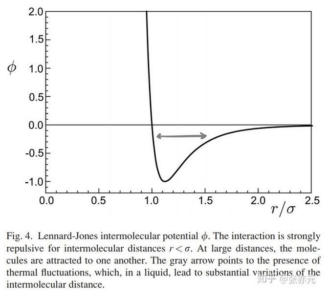 為了從源頭上理解毛細(xì)現(xiàn)象和表面張力,我們首先要考慮的就是液體分子間的作用力。事實上,一對液體分子間的作用力要么是引力,要么是斥力,與兩分子間距離相關(guān),一般可用Lennard-Jones勢能表示(圖4)。