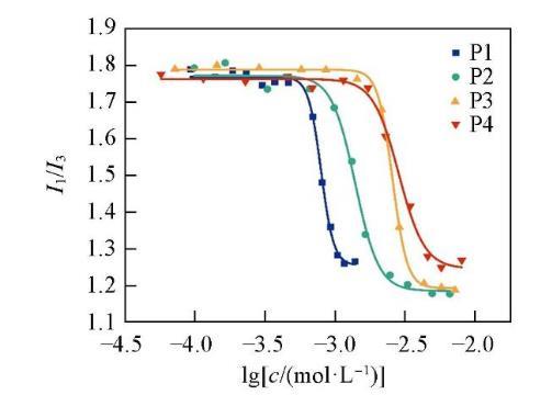 由圖3可見,當表面活性劑的濃度較低時,I1/I3在1.70——1.80之間波動;當表面活性劑濃度逐漸增加至cmc時,I1/I3值急劇下降,說明表面活性劑分子開始形成膠束,使得芘分子轉(zhuǎn)移至疏水膠束內(nèi),芘分子所處的環(huán)境極性發(fā)生突變;在較高表面活性劑濃度下,I1/I3值趨于穩(wěn)定,這是由于芘分子已經(jīng)完全處于膠束中,所處的環(huán)境極性不再發(fā)生變化。通過Boltzmann方程擬合得到表面活性劑P1,P2,P3和P4的cmc值分別為7.96×10-4,1.39×10-3,2.57×10-3和2.85×10-3 mol/L。結(jié)果表明,隨著聚氧乙烯鏈長度的增加,cmc逐漸增大。采用熒光法測得的cmc與采用表面張力法測得的cmc數(shù)值接近且變化趨勢一致。