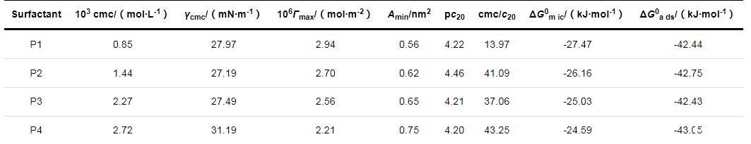 利用ΔG0a ds和ΔG0m ic表征表面活性劑的熱力學(xué)性質(zhì)。P1,P2,P3和P4的ΔG0a ds和ΔG0m ic均小于0,說明表面活性劑在氣/液界面層上的吸附行為以及在水溶液中形成膠束的行為是自發(fā)進行的。4種表面活性劑的ΔG0a ds均小于ΔG0m ic,表明表面活性劑分子在溶液中會先形成吸附層,當氣/液界面吸附達到飽和狀態(tài)后才開始在溶液內(nèi)部形成膠束聚集體。