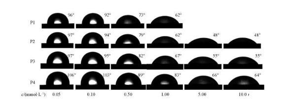 由圖2可知,P1,P2,P3和P4的cmc分別為8.51×10-4,1.44×10-3,2.27×10-3和2.72×10-3 mol/L;γcmc分別為27.97,27.19,27.49和31.19 mN/m.可見,隨著聚氧乙烯鏈長度的增加,4種非離子Gemini表面活性劑的cmc逐漸增加,這是由于隨著聚氧乙烯鏈長度的增加,表面活性劑的疏水作用減弱,不利于膠束的形成。γcmc隨著聚氧乙烯鏈長度的增加先減小后增加,其中P2的γcmc最低,為27.19 mN/m,這可能是由于P2分子內(nèi)部的親水性和疏水性達到了平衡,能穩(wěn)定排列在氣/液界面上,降低表面張力的能力最強。P2,P3和P4的γcmc隨著聚氧乙烯鏈長度的增加逐漸升高,這是由于親水性聚氧乙烯鏈長度的增加使得表面活性劑分子在水溶液中卷曲程度增大,在界面處占據(jù)的空間增大,降低了分子在界面上的鋪展緊密度,從而導(dǎo)致γcmc升高。