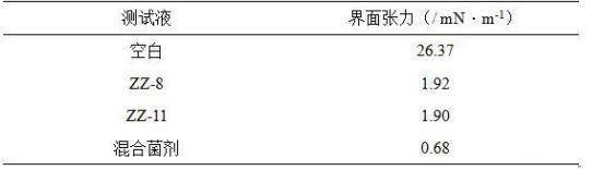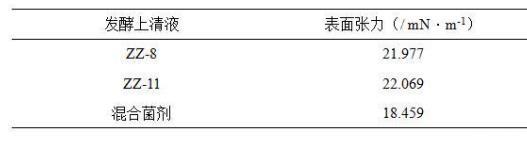表面張力是洗油劑對原油洗脫能力的重要指標,數(shù)值越低、洗脫能力越強。測試結(jié)果顯示解淀粉芽孢桿菌(Bacillus amyloliquefaciens)ZZ-11和膠凍樣芽孢桿菌(Bacillus mucilaginosus)ZZ-8發(fā)酵上清液均能降低表面張力,混合菌劑發(fā)酵上清液的表面張力值更低。