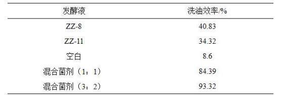 各組洗油效率測試結(jié)果如表3所示,解淀粉芽孢桿菌(Bacillusamyloliquefaciens)ZZ-11和膠凍樣芽孢桿菌(Bacillus mucilaginosus)ZZ-8發(fā)酵液均具有優(yōu)秀的洗油效率,本發(fā)明混合菌劑的洗油效率更為優(yōu)異,分別達到84.39%和93.32。