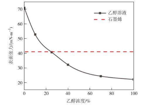 但是NMP存在價(jià)格昂貴、環(huán)境污染大的缺點(diǎn),因此尋求一種環(huán)境友好、成本低的球磨溶劑對微晶石墨細(xì)化產(chǎn)業(yè)化具有重要的意義。水和乙醇的表面張力分別為70.95 mN·m-1和22.17 mN·m-1,我們采用一定體積比的乙醇和水調(diào)配出與微晶石墨表面能接近的乙醇水溶液,并以此為溶劑球磨微晶石墨,研究溶劑的表面張力對球磨后微晶石墨粒徑的影響。從圖1可知,25%乙醇溶液的表面能為40.69 mN·m-1,與石墨烯的表面能(40.80 mN·m-1)相近,從圖2可知,其對應(yīng)的微晶石墨中位粒徑最小。當(dāng)溶劑的表面能與微晶石墨表面能相近時(shí),微晶石墨能更好地分散在溶劑中,從而提高球磨效率。所以在本工作中,選擇25%的乙醇水溶液作為球磨溶劑。