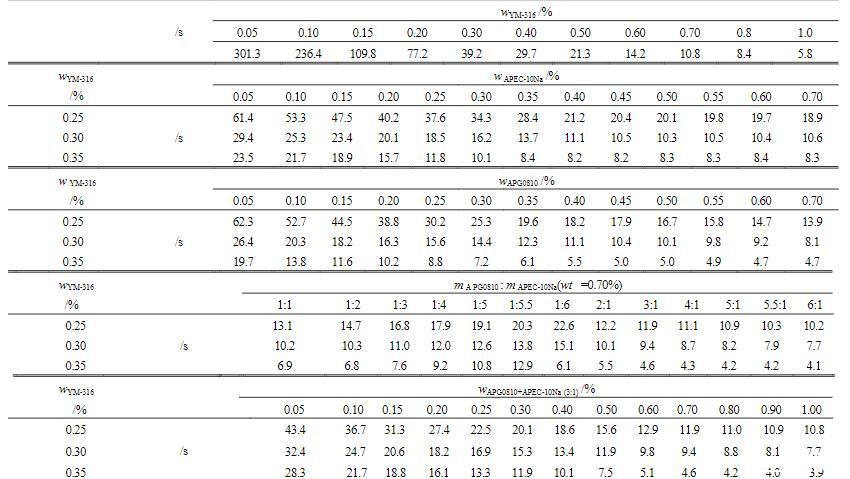 由表2可知,YM-316在質(zhì)量分?jǐn)?shù)較低時(shí)起泡能力較低,25%析液時(shí)間較長(zhǎng),隨著質(zhì)量分?jǐn)?shù)的升高,起泡高度呈現(xiàn)上升趨勢(shì),25%析液時(shí)間呈縮短趨勢(shì)。鑒于YM-316質(zhì)量分?jǐn)?shù)在0.25%~0.35%內(nèi),兼具較好的發(fā)泡性能和泡沫穩(wěn)定性,本實(shí)驗(yàn)選擇質(zhì)量分?jǐn)?shù)為0.25%、0.30%和0.35%的YM-316溶液,分別與APEC-10Na和APG0810進(jìn)行復(fù)配,研究復(fù)配溶液的泡沫性能。由表2可以看出,APEC-10Na和APG0810的引入,有助于提高溶液的發(fā)泡能力。當(dāng)APEC-10Na和APG0810質(zhì)量分?jǐn)?shù)在0.2%~0.5%時(shí),與YM-316復(fù)配效果最好,其中0.3%YM-316溶液與0.3%~0.5%APEC-10Na或APG0810復(fù)配后,溶液起泡效果和析液時(shí)間均較佳。綜合起泡能力和泡沫穩(wěn)定性兩方面性能,0.3%YM-316與0.7%的APEC-10Na和APG0810(APEC-10Na∶APG0810=1∶3)混合物組成的復(fù)配溶液具有最優(yōu)泡沫性能,其起泡高度最高達(dá)298mm,同時(shí)泡沫的25%析液時(shí)間可達(dá)到397s。