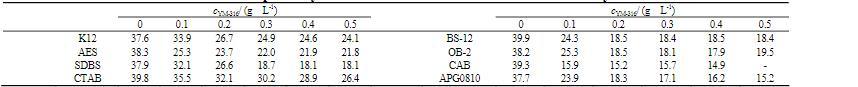 將不同濃度的YM-316分別與質(zhì)量濃度為4.0 g/L的陽離子表面活性劑,如十六烷基三甲基溴化銨(CTAB),陰離子表面活性劑,如十二烷基硫酸鈉(K12)、十二烷基聚氧乙烯醚硫酸鈉(AES)、十二烷基苯磺酸納(SDBS),兩性碳?xì)浔砻婊钚詣缡榛鸩藟A(BS-12)、椰油酰丙基甜菜堿(CAB)、十二烷基氧化胺(OB-2)及非離子APG復(fù)配后,測(cè)定復(fù)配溶液的表面張力,結(jié)果見表1。由表1可見,YM-316與陽離子或陰離子碳?xì)浔砻婊钚詣?fù)配后體系的表面張力降低不明顯,而YM-316與非離子或兩性碳?xì)浔砻婊钚詣?fù)配后體系的表面張力降低顯著,特別是與CAB或APG0810復(fù)配后其體系的表面張力可降至14.9 mN/m和15.2 mN/m。