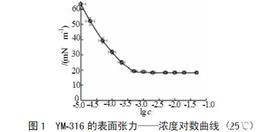 圖1 YM-316的表面張力——濃度對(duì)數(shù)曲線(25℃)