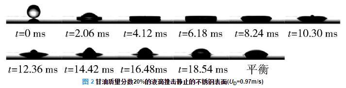 圖2是一個質(zhì)量分?jǐn)?shù)20%的甘油水溶液液滴撞擊靜止固體表面的典型過程。液滴(D0=2.85mm)以0.97m/s的速度撞擊在不銹鋼表面上(t=0ms),經(jīng)過鋪展達(dá)到最大鋪展面積(t=2.06ms),隨后經(jīng)歷回縮、再鋪展以及震蕩的過程(t=4.12~18.54ms),直至達(dá)到平衡。