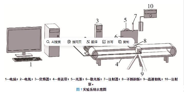 1—電腦;2—電機(jī);3—變頻器;4—傳送帶;5—光源;6—散光板;7—注射器;8—不銹鋼板;9—高速相機(jī);10—注射泵。