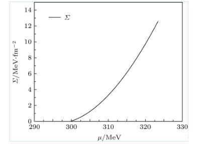 利用薄壁近似,圖2給出了當(dāng)T=Tc時,夸克強(qiáng)子一級相變的表面張力隨夸克化學(xué)勢的變化??芍谝患壪嘧儏^(qū)域,當(dāng)化學(xué)勢增大時,強(qiáng)子相的表面張力也隨著化學(xué)勢增大。當(dāng)溫度接近零時,強(qiáng)子夸克相變的表面張力約為12.6 MeV/fm2.在T→0的情況,本文理論預(yù)言與文獻(xiàn)一致,但該文獻(xiàn)只是考慮T=0的冷夸克物質(zhì)的夸克強(qiáng)子一級相變。