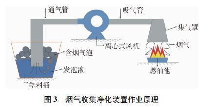 煙氣收集凈化裝置主要由置液桶、通氣管、離心式風(fēng)機(jī)、吸氣管、集氣罩和燃油池等組成,其凈煙工作原理如圖3所示。風(fēng)機(jī)抽走集氣罩下燃油池中汽油燃燒的黑煙,將其通入桶內(nèi)發(fā)泡液中;氣體進(jìn)入液體后會立刻浮出液面,在液體表面張力作用下排出液面的煙氣被液膜包裹成含煙氣泡;隨著煙氣不斷被通入發(fā)泡液中,含煙泡泡很快就溢滿整個置液桶。實(shí)驗(yàn)前測量并記錄水及發(fā)泡液的pH值。