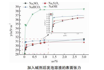 圖4是不同質(zhì)量分?jǐn)?shù)堿劑發(fā)泡液表面張力的測試結(jié)果。強(qiáng)堿NaOH使發(fā)泡液表面張力明顯提高,在NaOH質(zhì)量分?jǐn)?shù)3%時達(dá)到最大值38.3mN/m,隨后發(fā)泡液表面張力值保持穩(wěn)定,不受NaOH含量變化影響。說明NaOH濃度升高時OH-過多,造成圖4加入堿劑后發(fā)泡溶液的表面張力表面活性物質(zhì)停留于溶液表面,阻礙了OH-與更多表面活性物質(zhì)的反應(yīng)機(jī)會,溶液表面張力不再受影響。圖4中弱堿Na2S2O3,NaHCO3變化規(guī)律與NaOH相似,低濃度時發(fā)泡液表面張力激增,達(dá)到質(zhì)量分?jǐn)?shù)0.8%之后,表面張力值增幅減緩。NaOH加入使發(fā)泡液表面張力增加了35.7%,而其他3種弱堿無機(jī)鹽在濃度最大時(質(zhì)量分?jǐn)?shù)3%)僅增加約10%.與強(qiáng)堿劑相比,弱堿劑對溶液表面張力影響較小。