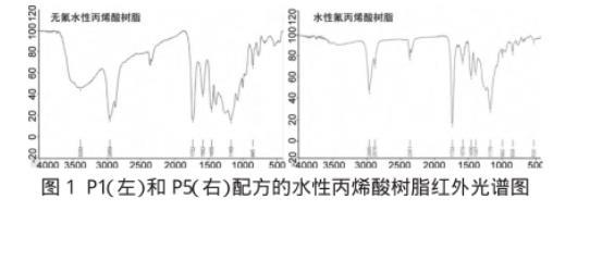 為了表征含氟丙烯酸酯單體是否已經(jīng)有效成為合成樹(shù)脂的一份子,我們對(duì)P1(不含氟的水性丙烯酸樹(shù)脂)和P5(水性氟丙烯酸樹(shù)脂)進(jìn)行了紅外光譜分析(圖1)。