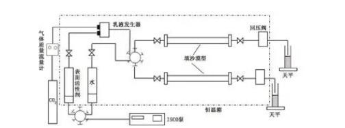 在油藏條件下,CO2一般處于超臨界狀態(tài)(31.26℃,7.38 MPa以上),超臨界CO2密度接近液體,與水溶液形成的分散體系稱為乳液更為合適,驅(qū)油過程中將超臨界CO2和表面活性劑水溶液形成超臨界CO2乳液是控制CO2流度的有效方法,能夠大幅改善CO2驅(qū)油效果。在超臨界CO2乳液驅(qū)替過程中,CO2乳液的界面特性會直接影響其穩(wěn)定性,從而影響CO2乳液在驅(qū)替過程中的封堵效果。目前,對CO2乳液的研究主要集中在反相微乳萃取分離、酶催化和納米材料制備等方面。筆者通過實(shí)驗(yàn)研究不同溫度、壓力條件下CO2乳液界面特性及其封堵效果。