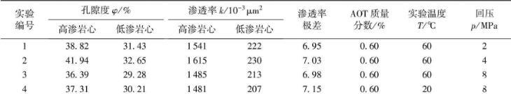 主要實(shí)驗(yàn)材料:選用2-(2-乙基己基)-磺酸琥珀酸鈉(AOT)為表面活性劑;實(shí)驗(yàn)用CO2純度為99.9%;實(shí)驗(yàn)用水為蒸餾水;實(shí)驗(yàn)巖心為填砂管模型,規(guī)格參數(shù):600 mm×Φ25 mm。表1、2所給出的回壓值即為巖心中流體所處的最低壓力,只有高于該回壓值,流體才可以流動。