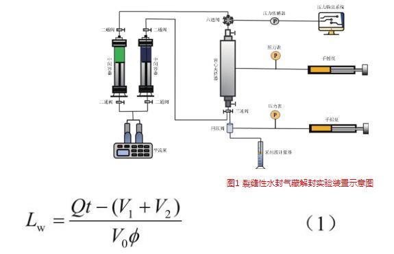 2)水封段塞制備及裂縫內壓力控制。將巖心夾持器垂直放置(圖1),使用驅替泵從巖心夾持器下端(出口端)低速注入不同長度的水段塞來模擬不同的水封程度,此時巖心出口端面與巖心夾持器堵頭間形成的裂縫中也充滿水。通過控制出口端壓力(回壓)可直接控制裂縫的壓力,從而研究基質—裂縫間壓差變化對解封過程的影響。水封段塞長度計算公式如下: