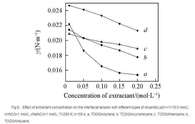 如圖8所示,以正辛烷作為稀釋劑時, TODGA/HNO3萃取La3+的界面張力隨著硝酸濃度的升高逐漸降低。根據(jù)文獻報道,在硝酸體系中, 3-氧戊二酰胺類萃取劑能夠萃取硝酸,萃取過程中隨著硝酸濃度升高,萃取分配比明顯增大。因此,硝酸濃度較高時TODGA與硝酸發(fā)生萃取締合作用,使中性萃取劑TODGA質(zhì)子化,其界面活性明顯增強,導致界面張力迅速降低,這與圖3結果一致。