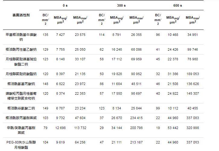 表面活性劑的泡沫形態(tài)數(shù)據(jù)如表3所示,包括10種表面活性劑溶液在產(chǎn)生最大泡沫體積之后的0,300和600 s時(shí)的泡沫密度(BC)、平均氣泡面積(MBAavg)和最大氣泡面積(MBAmax);同時(shí),選取了5種具有代表性的表面活性劑,對(duì)其泡沫形態(tài)進(jìn)行拍照觀察,如圖3所示。最初,所有陰離子表面活性劑的氣泡都非常小且均勻,其中椰油酰谷氨酸二鈉、椰油酰氨基丙酸鈉和甲基椰油?;;撬徕c這3種氨基酸表面活性劑的平均氣泡面積分別為6 787,6 822和7 427μm2;而兩性和非離子表面活性劑的平均氣泡面積較大,其中椰油酰胺丙基甜菜堿為9 732μm2、辛酰/癸酰氨丙基甜菜堿為12 698μm2、PEG-80失水山梨醇月桂酸酯為9 619μm2。在600 s時(shí),大多數(shù)陰離子表面活性劑氣泡的平均面積在30 000μm2以內(nèi),椰油酰兩性基乙酸鈉的平均氣泡面積為24 426μm2,其余兩性和非離子表面活性劑的平均氣泡面積均大于40 000μm2,其中辛酰/癸酰氨丙基甜菜堿達(dá)到53 442μm2。以上結(jié)果表明,甲基椰油?;;撬徕c、椰油酰谷氨酸二鈉具有較好的泡沫形態(tài)穩(wěn)定性,600 s后其泡沫密度和氣泡面積變化相對(duì)較小,而椰油酰胺丙基甜菜堿、辛酰/癸酰氨丙基甜菜堿、PEG-80失水山梨醇月桂酸酯的泡沫密度和氣泡面積變化相對(duì)較大,其泡沫形態(tài)穩(wěn)定性較差。