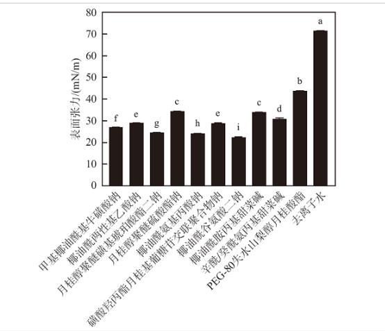 將10種表面活性劑的去離子水溶液(pH=6.0)進(jìn)行表面張力測(cè)定,結(jié)果如圖1所示。去離子水的表面張力為71.81 mN/m;所有表面活性劑均可顯著降低去離子水的表面張力,其中PEG-80失水山梨醇月桂酸酯降低表面張力的能力最差,為43.73 mN/m;月桂醇聚醚硫酸酯鈉和椰油酰胺丙基甜菜堿水溶液的表面張力無顯著差異,分別為34.14和33.87 mN/m;辛酰/癸酰氨丙基甜菜堿水溶液的表面張力為30.54 mN/m;椰油酰兩性基乙酸鈉和磺酸羥丙酯月桂基葡糖苷交聯(lián)聚合物鈉水溶液的表面張力無顯著差異,分別為28.88和28.71 mN/m;甲基椰油酰基?;撬徕c水溶液的表面張力為26.74 mN/m;月桂醇聚醚磺基琥珀酸酯二鈉水溶液的表面張力為24.16 mN/m;椰油酰氨基丙酸鈉水溶液的表面張力較低,為23.84 mN/m;椰油酰谷氨酸二鈉水溶液的表面張力最低,為22.08 mN/m。