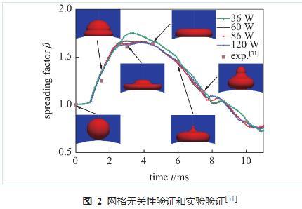 為了定量分析網(wǎng)格數(shù)量對數(shù)值模擬結(jié)果準(zhǔn)確性的影響,以液滴撞擊壁面時(shí)的鋪展因子作為定量分析指標(biāo)及網(wǎng)格無關(guān)性驗(yàn)證的評(píng)判標(biāo)準(zhǔn)。網(wǎng)格數(shù)量從36 w開始增加,每次增長大約30 w,并繪制液滴鋪展因子β隨時(shí)間變化與網(wǎng)格數(shù)量的關(guān)系圖。如圖2所示,網(wǎng)格數(shù)在86 w以上時(shí)基本不會(huì)對模擬結(jié)果產(chǎn)生影響,為保證模擬精度并確保求解時(shí)間,本文采用86 w網(wǎng)格數(shù)作為模型的基準(zhǔn)網(wǎng)格數(shù)進(jìn)行模擬。從圖中也可以看出,數(shù)值模擬結(jié)果與參考文獻(xiàn)中的實(shí)驗(yàn)結(jié)果趨于一致,說明本文采用的模型可以用于研究液滴撞擊球面的Leidenfrost現(xiàn)象。