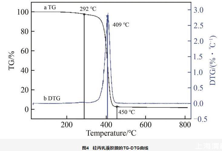 從圖4可以看出,膠膜失重分為3個(gè)階段:在292℃前,失重2.54%,此時(shí)失去的是膠膜中的水及小分子物質(zhì)的揮發(fā),膠膜并未發(fā)生分解;293~450℃之間為共聚物的熱分解階段,該范圍失重95.30%,且分解速度較快,主要是Si—O、C—C、C—O和C—H鍵的斷裂所致;450~800℃之間失重0.43%,這是共聚物分子鏈的斷裂和分解,分解速度較為緩慢;800℃基本分解完全,僅剩下1.73%的灰分,證明硅丙乳液膠膜具有良好的耐熱性。由DTG曲線可以看出,409℃熱分解速率最大,說(shuō)明硅丙乳液具有良好的熱穩(wěn)定性,這是因?yàn)樵诠簿畚锓肿又幸肓司哂休^高鍵能的Si—O—Si鍵的結(jié)果。