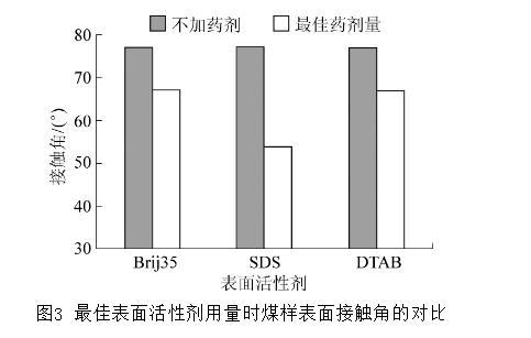 表面活性劑對(duì)煤表面性質(zhì)的影響,本質(zhì)是表面活性劑與煤表面之間發(fā)生了吸附,這種影響可以通過接觸角的變化體現(xiàn)。通過測定煤樣與藥劑(最佳藥劑用量)作用前后接觸角的變化來表征藥劑對(duì)煤樣表面親疏水性的影響。最佳表面活性劑用量時(shí)煤樣表面接觸角的對(duì)比如圖3所示,3種藥劑作用后煤樣的接觸角均有不同程度的下降,SDS作用后接觸角降低最明顯,降低了23.5°,DTAB和Brij35作用后接觸角降低較少,都只降低了10°。產(chǎn)生這一現(xiàn)象的原因可歸結(jié)為:表面活性劑具有兩親性質(zhì),當(dāng)親水基團(tuán)較多的吸附于煤表面時(shí)可提高煤表面疏水性,而當(dāng)疏水基團(tuán)較多地吸附于煤表面可提高煤表面的親水性。選取的煤樣為浮選精煤,表面自身疏水性強(qiáng),與表面活性劑作用時(shí),更容易使表面活性劑的非極性疏水端吸附于煤表面,極性親水端暴露在外面,從而導(dǎo)致煤樣表面親水性增強(qiáng),接觸角變小。煤樣表面親水性增強(qiáng),導(dǎo)致煤表面吸附水增多或水化膜變厚,因而,從這種意義上來說,表面活性劑的加入不利于脫水,還可能使濾餅水分增加。然而,圖1結(jié)果表明添加表面活性劑可以顯著降低濾餅水分,其原因?qū)⑴c下節(jié)表面張力測試結(jié)果結(jié)合起來分析。